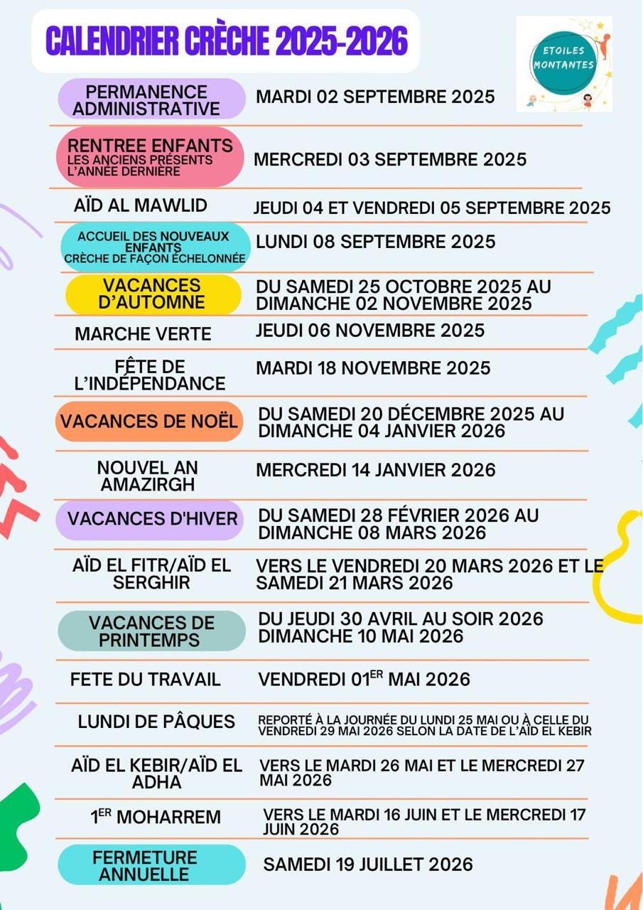 Le calendrier de fermeture de la crèche (jours fériés, ponts et fermetures annuelles d’été et vacances scolaires) est transmis en juillet pour l’année suivante.